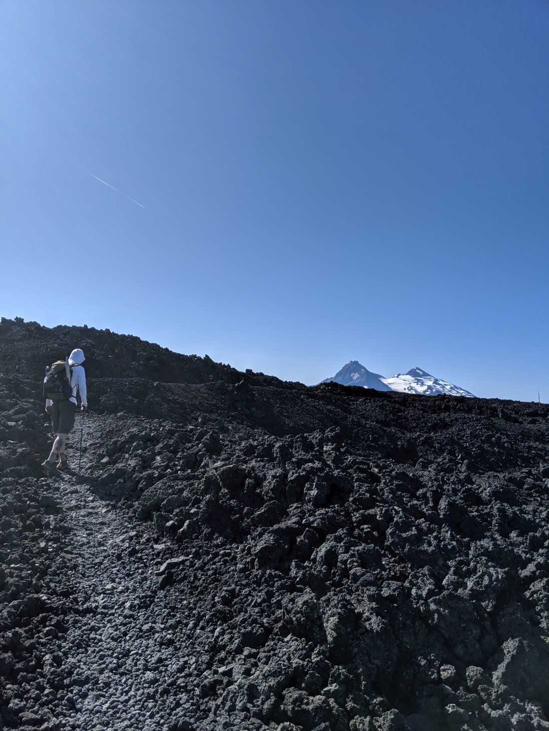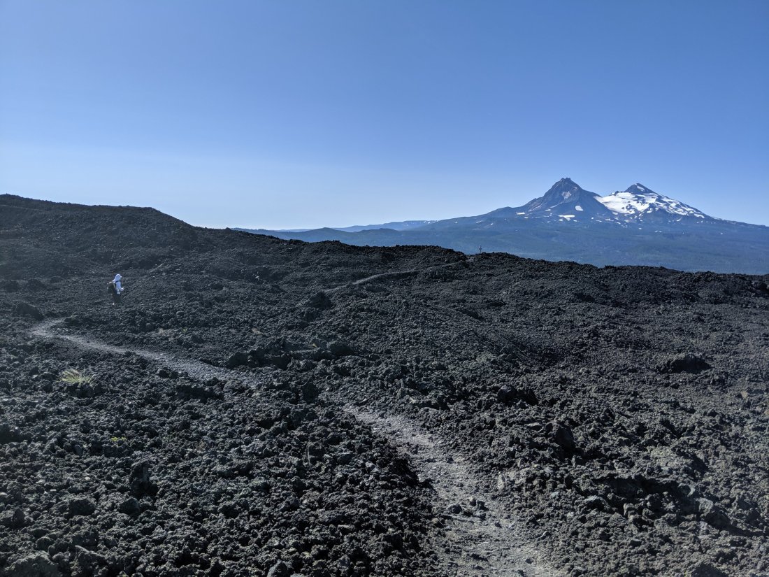 We hiked 8 miles over a lava flow with no water that morning. We packed out just enough from the Youth Camp for breakfast and had maybe a liter to share between us to drink. It was hot and exposed, and the lava rock was hard to walk on, shifting under your feet with every step, slowing progress. It was just starting to get really hot when we arrived at the highway to find a guy in an SUV doing trail magic. He gave us Gatorade, watermelon, and filled up our bottles for us, I had been ranting to O’Well about all the watermelon I was going to eat when we got to town – the trail provides.