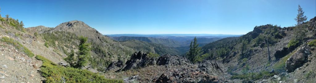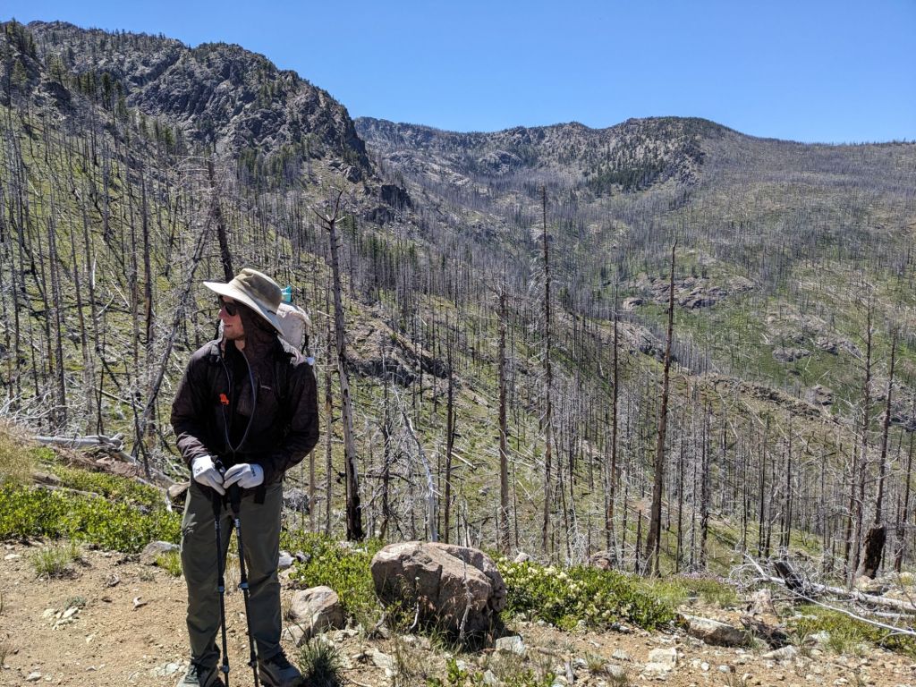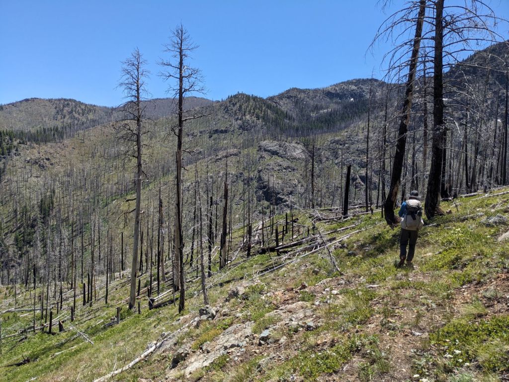 We started hiking in earnest the next morning, picking up 4000 feet of elevation in one shot. I did not sleep well, having the first night jitters and not being very tired (yet), but I forgot about that very quickly as I huffed and puffed up the forest service road. Even once we gained “cruising altitude” according to O’Well, and found ourselves on actual trail, we just seemed to continue going up, although at a more gentle grade. There was a brief section where we dropped 1500 feet, only to regain it on the other side, and while the descent was a break for our burning thighs, it posed other problems. We were moving through a burn area, and because the trail is unmaintained, this means that there are countless downed trees over the trail, as well as scrubby vegetation growing back and obscuring the trail often. We picked our way carefully down the steep grade, sometimes losing the trail, sometimes twisting ankles or sprawling headlong in the dirt. It was almost a relief to be climbing again on the other side, for some reason the vegetation hadn’t grown as thick on the east facing slope as the west facing slope we had descended and going up was much easier. At our next break though we discovered another problem with traversing unmaintained trail; we were all crawling with ticks. As soon as this was discovered a thorough tick check was undertaken, stripping off shirts and pants in the middle of the trail, “Can you check my back?” “Ugh, this one already started biting.” Tick checks became our first chore at every break.