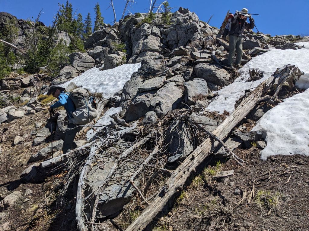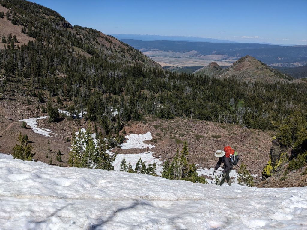 We got to our first snow crossing on the ascent to Strawberry Mountain. When we chose July to hike, we understood that one of the risks of hiking so early was the potential that the snow may not have fully melted off. This was not too daunting as we had all experienced snow crossings in Washington on the PCT in June, and we had packed microspikes to provide traction in such cases. On this particular crossing, the snow had melted off enough that we were able to circumnavigate it on the rocks. This was fortunate because the snow patch ended in a 1000 foot precipice and losing your footing on that snow would have been ill advised. We reached the saddle to Strawberry mountain and began the descent, and immediately realized that this was in fact the section we had brought our microspikes for. Up until then we had been feeling like they were just dead weight in our pack, but the backside of Strawberry Mountain was home to a cornice, melting off nicely but still very much obstructing the trail. Gretzky went first and carefully kicked steps into the snow. It turned out to be less steep of a descent than it looked from above and we all made it down without incident, although it took some extra time.