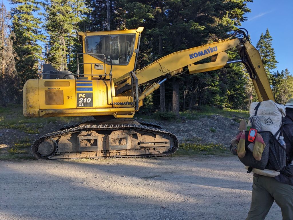 We camped near a paved road crossing and were woken up before dawn by some logging trucks bringing in equipment. I was able to fall back asleep despite the disturbance, the exhaustion finally having caught up to me, but I was workne up again when we started hearing trees being felled at 5:30. “Do we need to get out of here?” I asked O’Well and he shrugged, “We should be fine.” This was not too encouraging. Then a huge piece of logging equipment came clattering down the road and making a huge racket. O’Well said they were just staging equipment, and by the time we left camp there was no one to be seen.