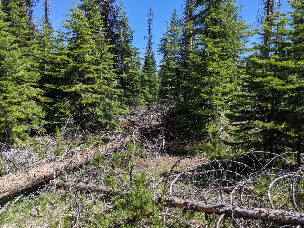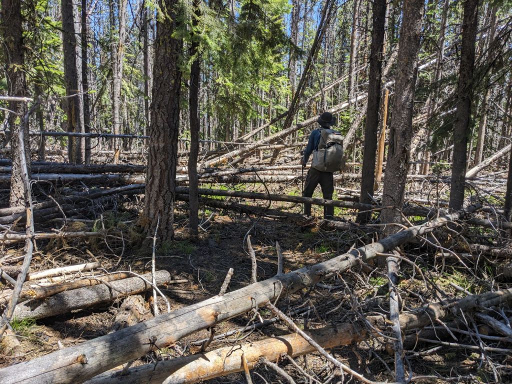 Though the trail is unmaintained, we had been making efforts to improve the conditions as we went. Sometimes this just meant sweeping sticks and logs out of the path, other times it was righting a collapsed rock cairn or, in O’Well’s case, clearing a blocked culvert. On sections with lots of blowdowns, we spent a lot of time snapping limbs off the dry, dead logs to create easier routes through the mess. We seemed to be the first people to have traveled the trail since the winter, given how tangled everything still was.
