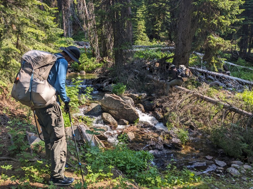 We continued on through the Greenhorn Mountains and ended up on a section where there was once again supposed to be trail but it was easy to lose and we did even more bushwhacking. When we finally did get to a smooth trail, meandering pleasantly through a series of lakes it was absolutely swarming with mosquitoes and we had to basically run to keep them off of us. We were actually relieved when the trail dumped us out on a wide gravel forest service road. So relieved that we didn’t realize we had missed our last opportunity for good water before our intended campsite, meaning we would have to go another 6 miles to get to water and it was already after 5 pm. Rather than backtracking and wasting time, we decided to go for it.