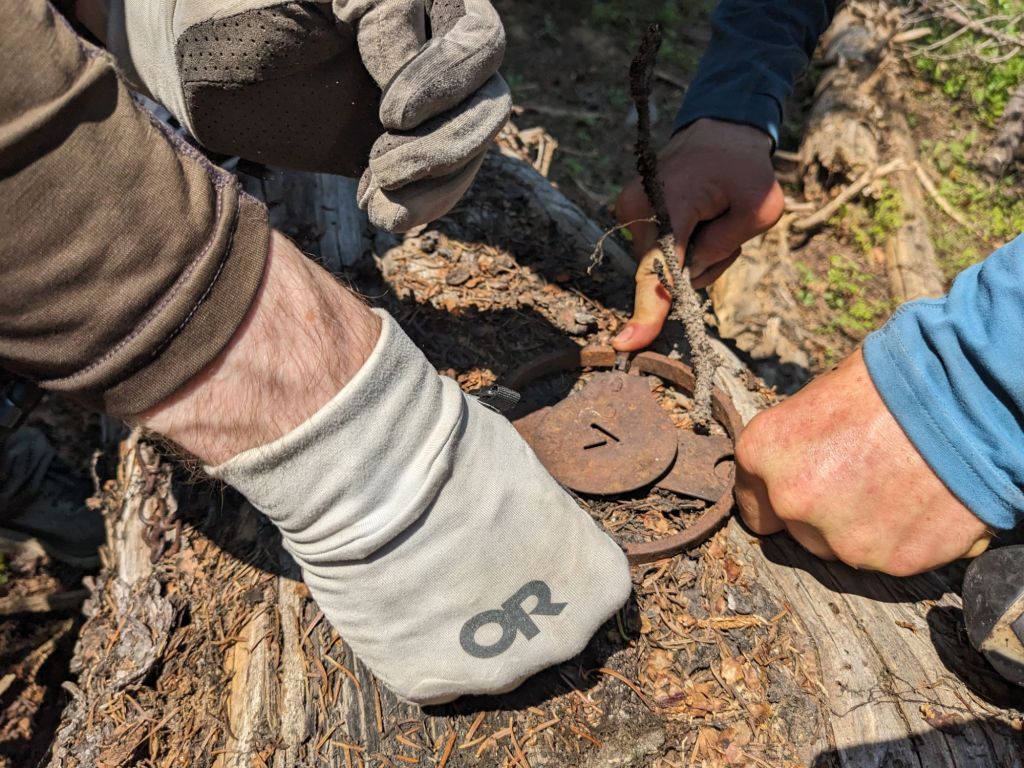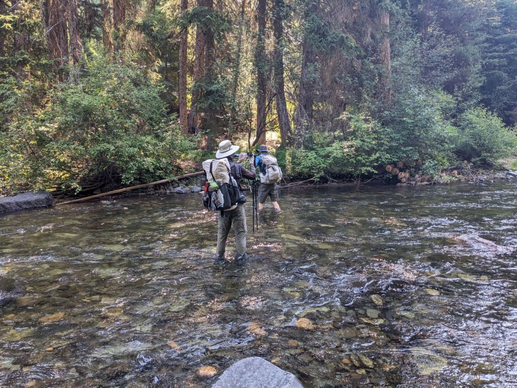 We did just 16.5 miles the next day and my feet did improve greatly. Most of the day was on a really nicely defined trail called the Miner Blackwell trail which snaked pleasantly through the river valley. We saw 3 or 4 separate mining cabins and lots of remnants of mining operations which O’Well was very interested in. We then followed a different creek up the canyon and through a long and lovely meadowy section and by the end of the day we were back on FS roads. I made a point of getting my feet elevated every time we stopped for a break and stretching my calves really well. We also had to ford the river twice, which was nice to get my feet submerged in the cold water. The first time I took off my shoes and went barefoot but the second time I just plowed through, shoes and pants and all; it was so hot. We were already wet so we decided to just strip off and jump in to cool off. We weren’t in too much of a rush, by the end of the day we only had 17 miles to get into Sumpter the next day and we ended the night early, camping at the site of another mining cabin and chatting pleasantly about our families and our lives back home, enjoying each others company and the absence of mosquitoes and hoping for what I imagined would be a relatively low-key day into town and a hot shower the next day.