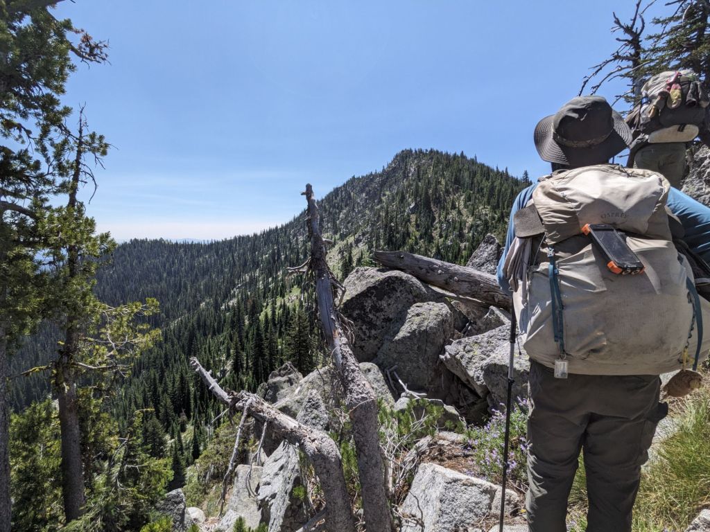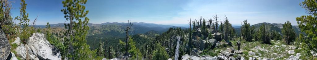 Somehow, every time the trail seemed to have taken an easier course, it found ways to reach new levels of torment. We didn’t realize there was a huge climb to the top of Crown Point, 8000 feet, and then 5 miles of cross country travel to get all the way off the summit to the forest road into the valley where Sumpter lay. We did ultimately make it to the Gold Rush Campground in Sumpter by 6:30 but we took a beating to get there. The climbing was intense to reach the Northern ridgeline spurring off the peak, and then we had to traverse the ridgeline, again with no trail to reach the summit. We scrambled over and around huge boulders, borrowing mountain goat trails when they suited and making our own way when the game wandered in a different direction. The summit was beautiful, with a lovely meadow filled with butterfly’s and a 300 degree view. I made sure to take a moment to pause and appreciate that view – once again we had worked for it, and I knew we were about to work just as hard to lose all that elevation we had just gained.
